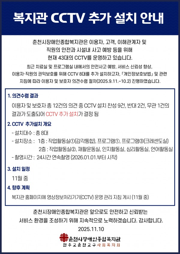 최근 치료실 및 프로그램실 내에서의 안전사고 예방, 서비스 신뢰성 향상, 이용자·직원의 권익보호를 위해 CCTV 8대를 추가 설치하고자, 「개인정보호보법」 및 관련 지침에 따라 이용자 및 보호자 의견수렴 절차(2025.9.11.~10.2) 진행하였습니다.