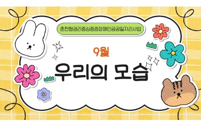 안녕하세요! 요새 날씨가 점점 추워지고 있는데요~일자리 참여자 분들 께서는 여전히 열심히 참여해 주고 계시며, 발전된 모습을 보여주고 계십니다.앞으로 다가올 10월의 모습 많이 많…