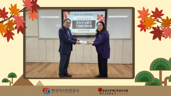 2025년 9월 30일(화), 한국가스안전공사 강원광역본부에서 저희 복지관을 방문해 주시고, 장애인복지의 발전을 위한 따뜻한 격려와 함께 백만원 상당의 온누리 상품권을 후원해 주셨습니다.