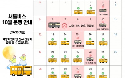 10월 셔틀버스 운행일정입니다.차량지원사업 신규 신청시 변동 될 수 있습니다. (9/30 기준)결행일 : 10/3(금) 개천절, 10/6(월)~10/9(목) 추석연휴, …