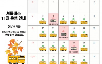 11월 셔틀버스 운행일정입니다.차량지원사업 신규 신청시 변동 될 수 있습니다. (10/31 기준)결행일 :11/4(화) 담당자 연차11/12(수) 차량지원사업11/20(목) 담당자…