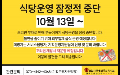 10월 13일(월)부터 조리원 부재로 인해 부득이하게 식당운영을 잠정 중단합니다.불편을 줄이기 위해 외부업체 급식 운영 예정입니다.희망자는 서비스담당자, 기획운영지원팀에 신청 및…