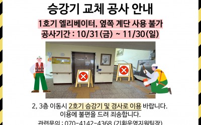 1호기 엘리베이터, 옆쪽 계단 사용 불가공사기간 : 10/31(금) ~ 11/30(일)2, 3층 이동시 2호기 승강기 및 경사로 이용 바랍니다.이용에 불편을 드려 죄송합니다.관련문…