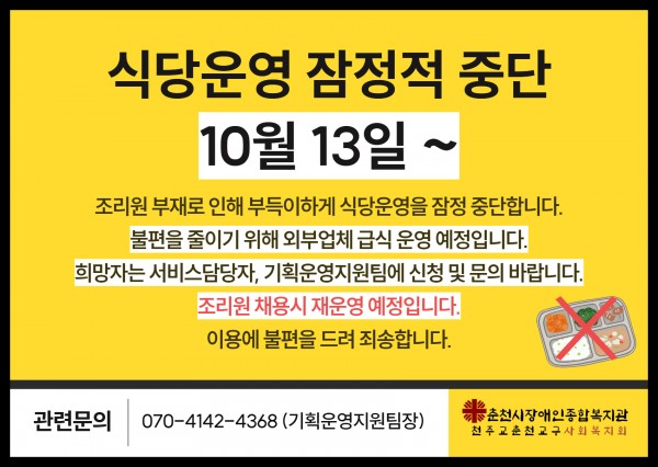 10월 13일(월)부터 조리원 부재로 인해 부득이하게 식당운영을 잠정 중단합니다.불편을 줄이기 위해 외부업체 급식 운영 예정입니다.희망자는 서비스담당자, 기획운영지원팀에 신청 및 문의 바랍니다.조리원 채용시 재운영 예정입니다.이용에 불편을 드려 죄송합니다.관련문의 070-4142-4370 (기획운영지원팀장)