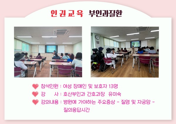 2층 집단활동실에서 "부인과질환" 교육을 실시하였습니다.