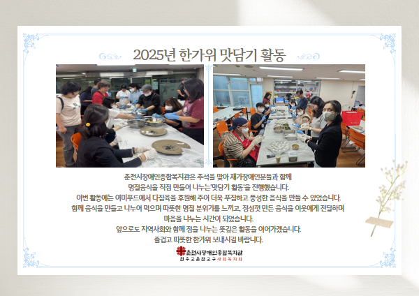 내용: 춘천시장애인종합복지관은 추석을 맞아 재가장애인분들과 함께 명절음식을 직접 만들어 나누는 '맛담기 활동'을 진행했습니다.
