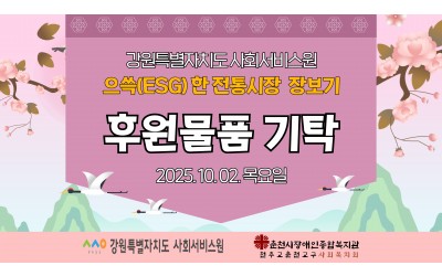 강원특별자치도사회서비스원 ESG 장보기 행사 방문2025년 10월 3일, 강원특별자치도사회서비스원이 ‘으쓱(ESG)한 전통시장 장보기 행사’를 통해 복지관을 방문해주셨습니다.장애인…