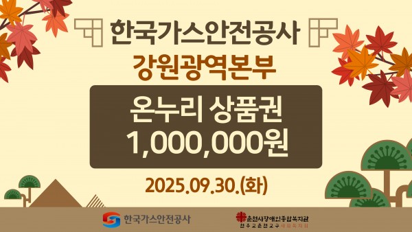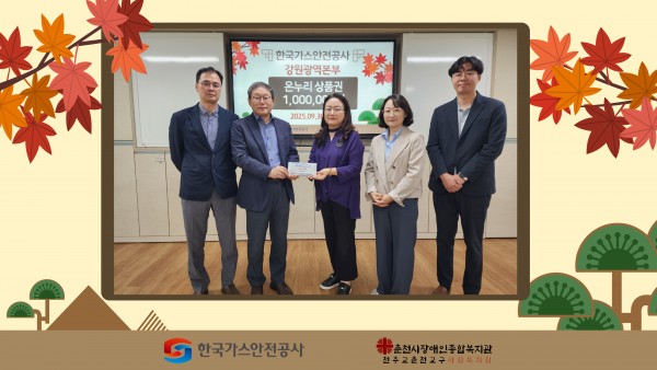 2025년 9월 30일(화), 한국가스안전공사 강원광역본부에서 저희 복지관을 방문해 주시고, 장애인복지의 발전을 위한 따뜻한 격려와 함께 백만원 상당의 온누리 상품권을 후원해 주셨습니다.